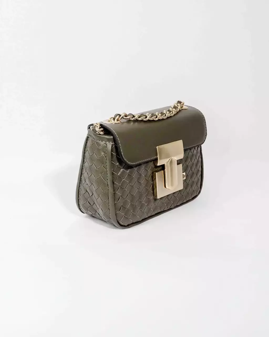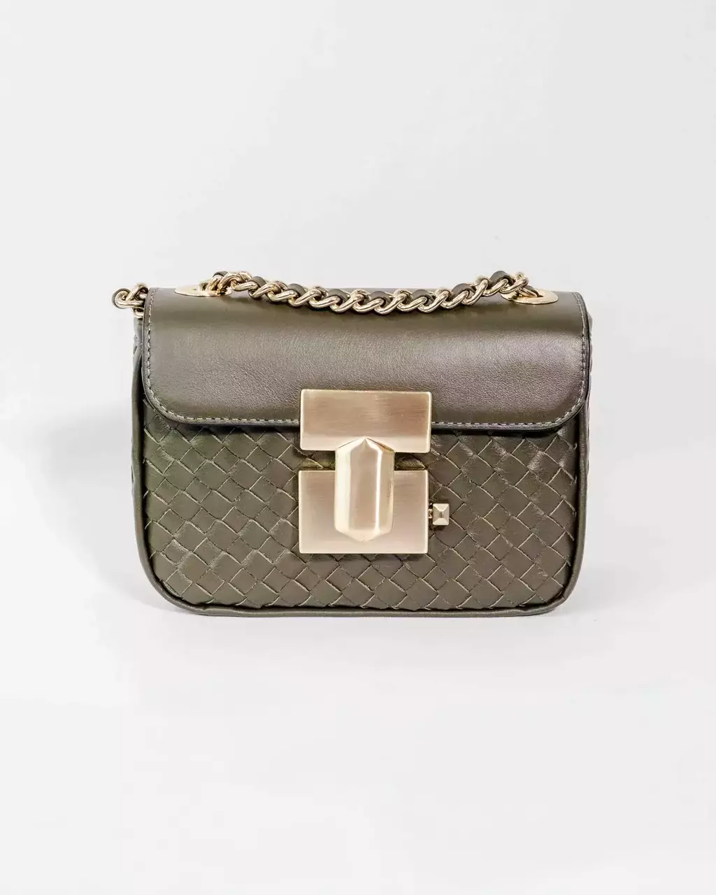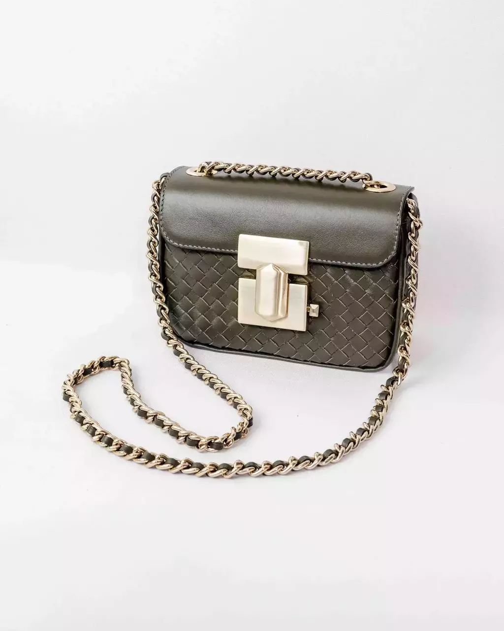 Seu fecho imponente confere personalidade e elegância, enquanto a alça de corrente com couro entrelaçado adiciona um toque de requinte e conforto ao usar. O interior é forrado em suede macio, com bolso interno e mosquetão exclusivo porta-chaves, garantindo praticidade no dia a dia sem abrir mão da sofisticação.