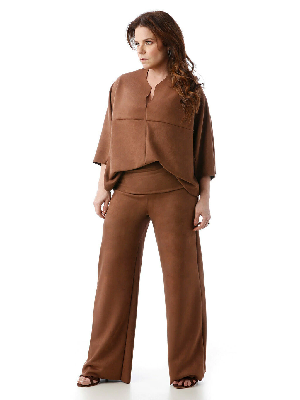 Calça Pantalona de Scuba, tecido encorpado, com toque macio, caimento estruturado.