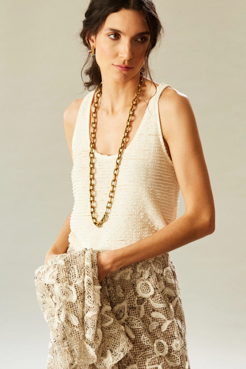 REGATA ALONGADA, EM TECIDO DE MALHA COM RELEVO DE MINI BABADO.